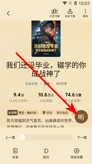 2、在小說詳情頁面,點(diǎn)擊聽按鈕,進(jìn)入小說收聽界面。