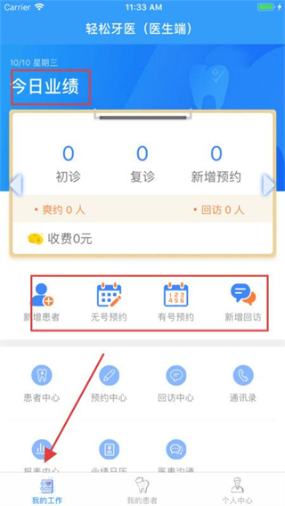 2、在我的工作頁(yè)面,能查看今日業(yè)績(jī),還可進(jìn)行新增患者、無(wú)號(hào)預(yù)約、有號(hào)預(yù)約、新增回訪(fǎng)等操作,助力醫(yī)生高效開(kāi)展日常診療工作。