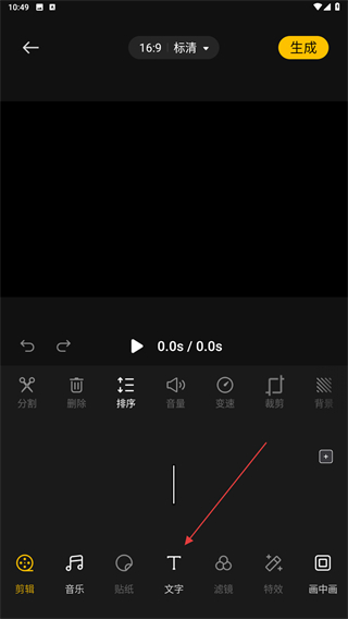 3、進入剪輯的界面內(nèi),用戶需點擊下方文字的功能按鈕。