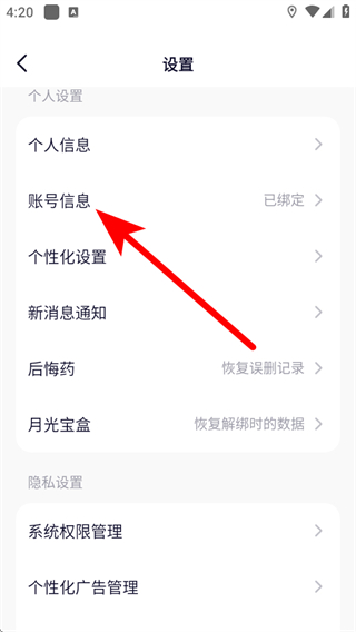 3、在設置頁面中,找到并點擊賬號信息選項。