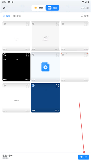 2、在視頻選擇的界面內(nèi),選擇后并點擊右下角下一步的按鈕。