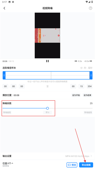 3、進(jìn)入視頻降噪的頁面內(nèi),設(shè)置好降噪系數(shù)后再點擊導(dǎo)出視頻即可。