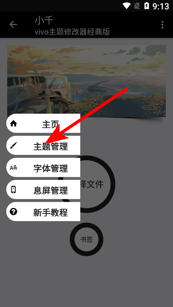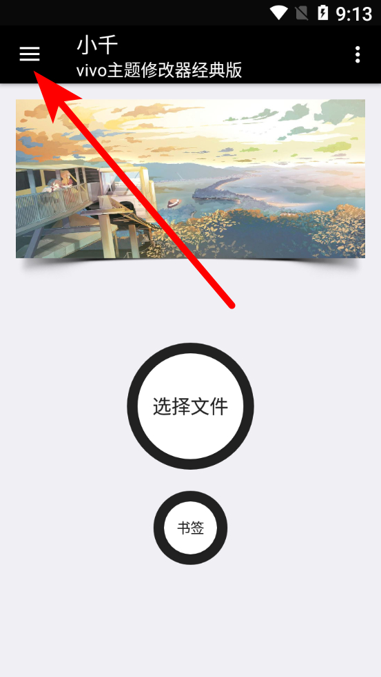 1、在小千vivo主題修改器首頁(yè),點(diǎn)擊左上角三條杠,展開功能菜單。