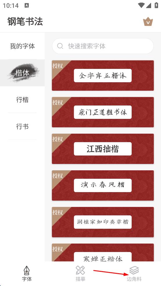 1、打開鋼筆書法APP,點(diǎn)擊右下角邊角料。