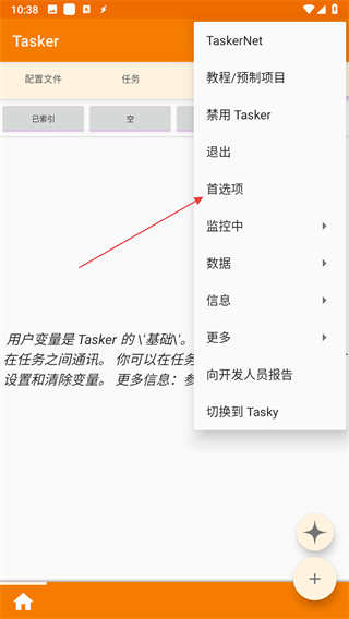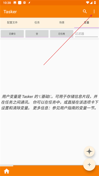 1、打開(kāi)Tasker應(yīng)用,找到并點(diǎn)擊右上角的三點(diǎn)菜單按鈕。