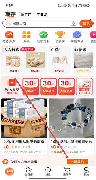 2、在進入到1688首頁中時,可以點擊下方一鍵登錄按鈕,準(zhǔn)備首頁淘寶賬號進行登錄。