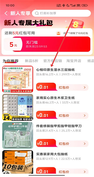 4、在登錄完成后跳轉(zhuǎn)到新人專享頁面,即可點擊任意商品進入查看商品詳情。