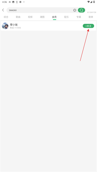 3、搜索結(jié)果出來后,點(diǎn)擊用戶右側(cè)+關(guān)注的功能按鈕。