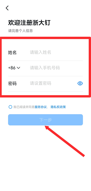 2、進(jìn)入注冊頁面后,依次填寫信息后,點擊下一步。