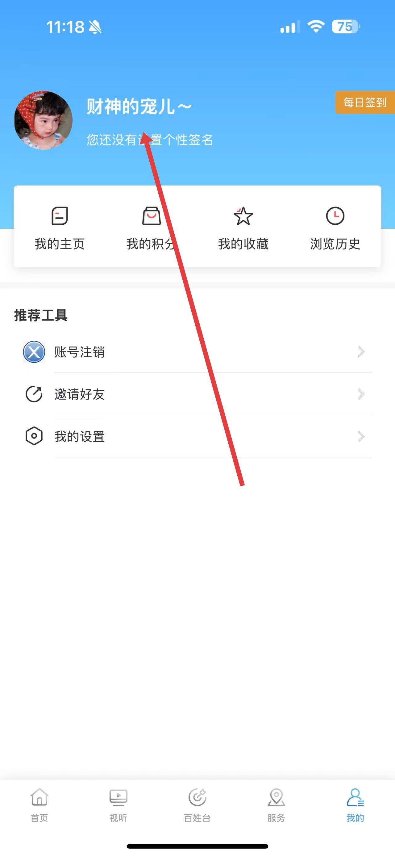 2、進入我的頁面后,點擊頁面上方的頭像或者昵稱區(qū)域。