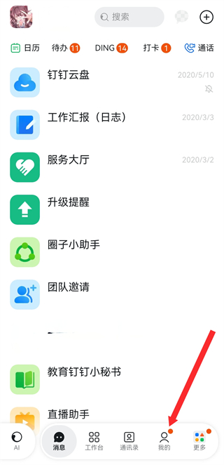 1、打開釘釘APP,點擊底部導(dǎo)航欄的我的,進入個人功能頁面。