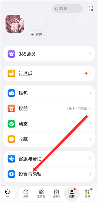 2、在個人功能頁面,找到設(shè)置與隱私選項,點擊進入設(shè)置與隱私界面。