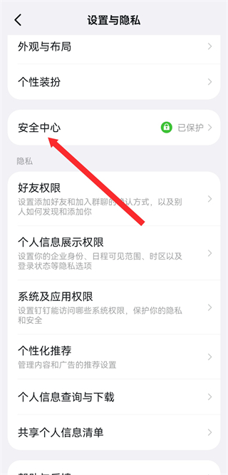 3、在設(shè)置與隱私界面,找到安全中心入口,點擊進入安全中心頁面。