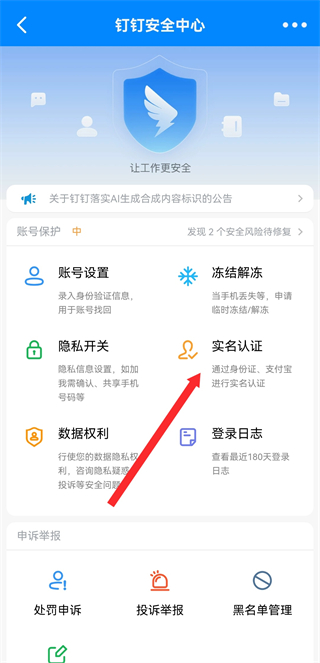 4、在釘釘安全中心頁面,找到實名認(rèn)證選項,進入認(rèn)證流程完成操作。