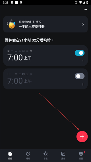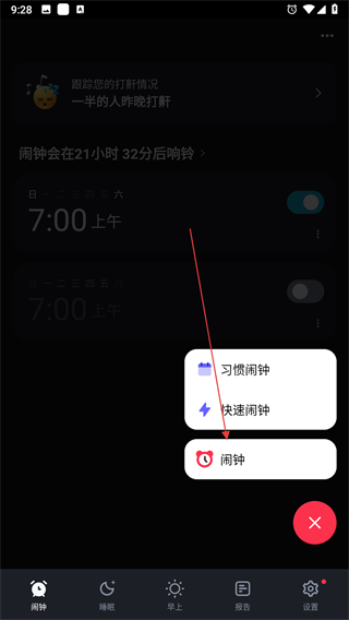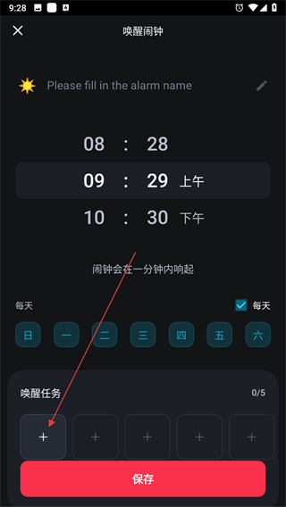 1、打開使命鬧鐘應用,點擊右下角紅色+按鈕,彈出選項窗口。