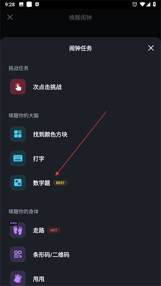 4、在鬧鐘任務列表中,選擇想要設置的喚醒任務,比如數(shù)學題。