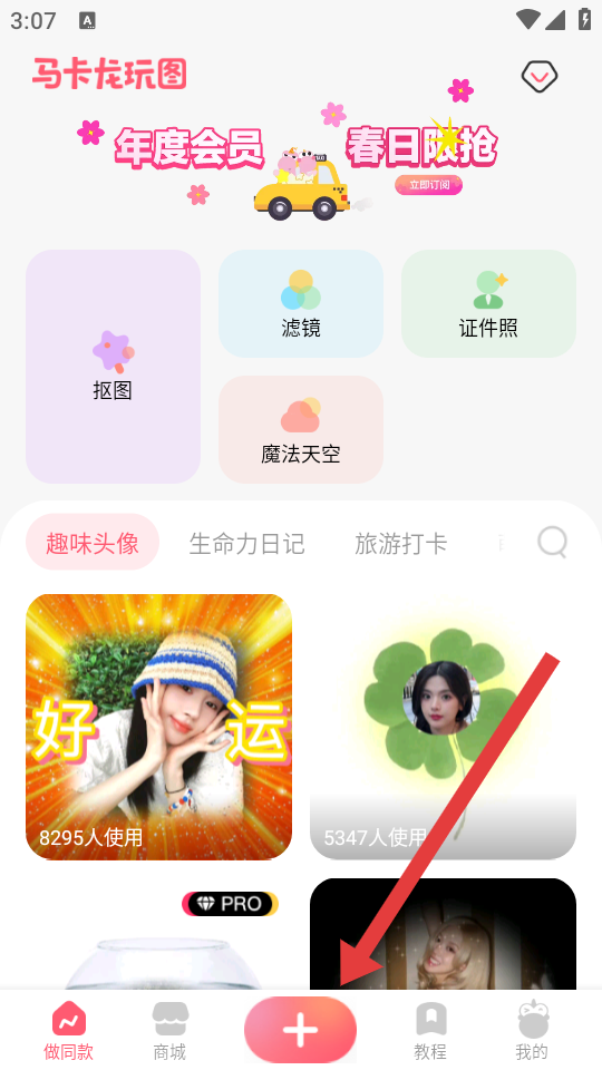 1、在馬卡龍玩圖首頁,點(diǎn)擊底部中間的粉色+按鈕,進(jìn)入圖片選擇界面。