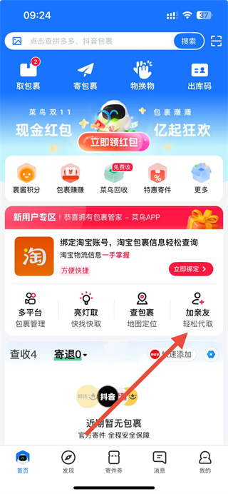 1、在菜鳥app首頁,點擊加親友選項,進入選擇好友類型頁面。