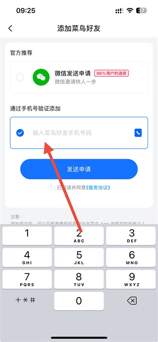 4、也可選擇通過手機號驗證添加,輸入菜鳥好友手機號碼后發(fā)送申請,完成親友添加。
