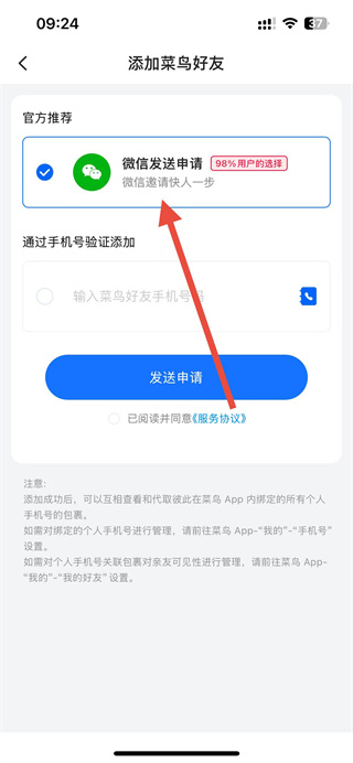 3、在添加菜鳥好友頁面,可選擇微信發(fā)送申請方式,通過微信邀請親友。