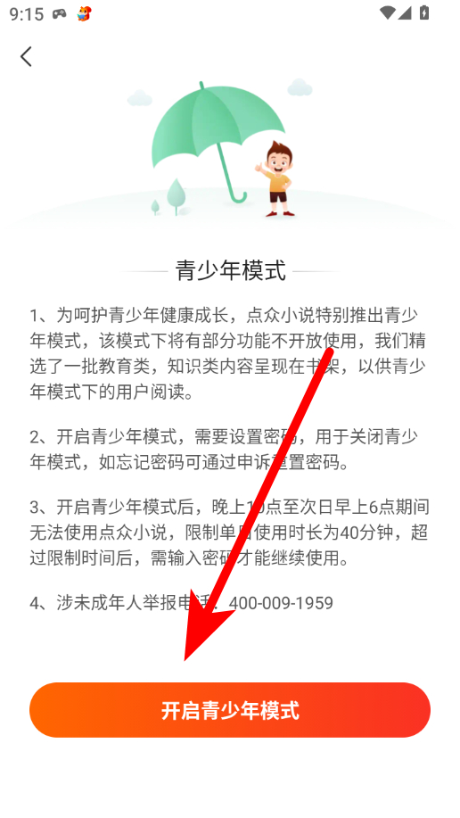 4、在青少年模式頁(yè)面,點(diǎn)擊“開啟青少年模式”按鈕,按提示操作即可開啟。
