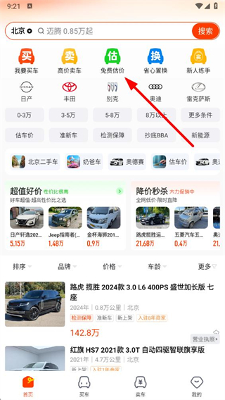 1、在人人車首頁(yè)找到綠色免費(fèi)估價(jià)按鈕,點(diǎn)擊進(jìn)入估價(jià)流程。