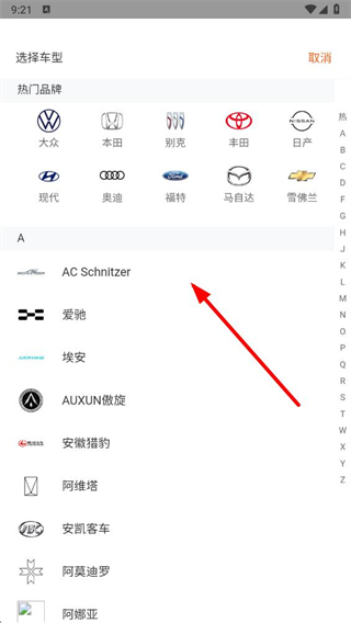 3、在選擇車型頁(yè)面,可從熱門品牌圖標(biāo)或按字母分類的品牌列表中,選擇自己車輛的品牌。