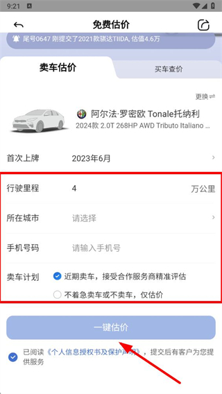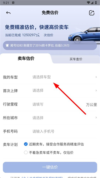4、填寫行駛里程、所在城市、手機(jī)號(hào)碼,選擇賣車計(jì)劃后,點(diǎn)擊一鍵估價(jià)按鈕,即可完成二手車估價(jià)申請(qǐng)。