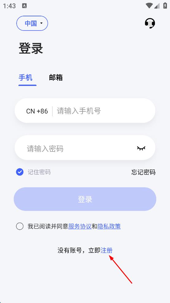 1、打開某軟件,進入登錄頁面,點擊“沒有賬號,立即注冊”,進入注冊頁面。