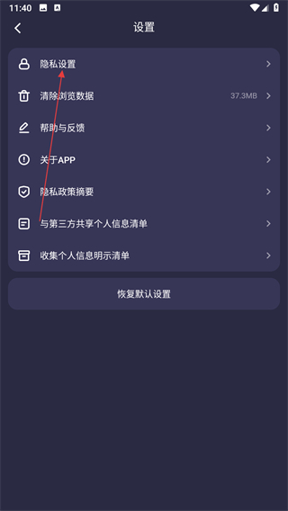 3、在設置頁面中,點擊隱私設置選項,進入隱私設置頁面。