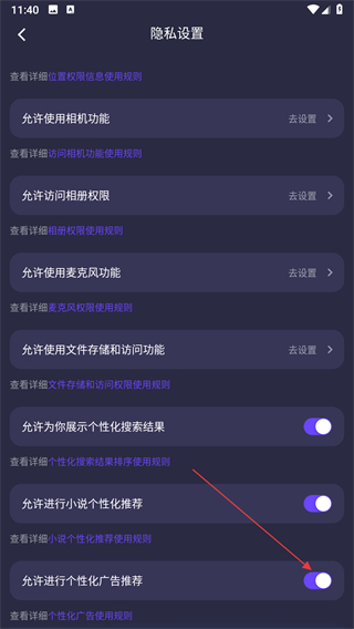 4、找到允許進行個性化廣告推薦選項,點擊開關按鈕將其關閉。