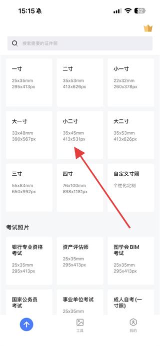2、選擇需要的證件照尺寸,如小二寸。