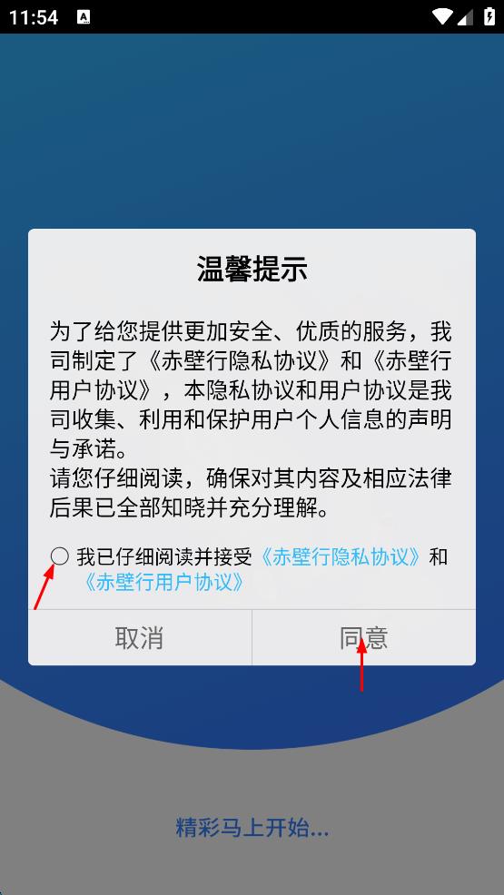 1、打開赤壁行App,出現(xiàn)溫馨提示彈窗,勾選已仔細閱讀并接受相關(guān)協(xié)議,點擊同意按鈕。