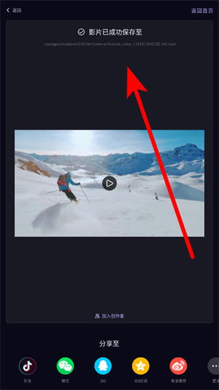 4、選擇好分辨率后,等待視頻導出完成,導出成功后會提示影片保存路徑,還可選擇分享至抖音、微信等平臺。