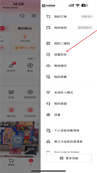 3、在右側(cè)彈出的菜單欄中,找到并點(diǎn)擊觀看歷史的按鈕。