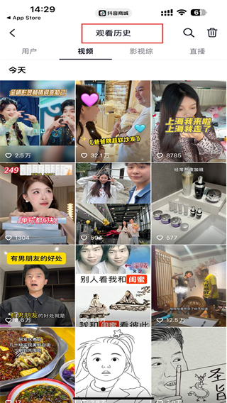 4、進(jìn)入觀看歷史的頁面內(nèi),可觀看視頻、影視綜、直播的記錄。