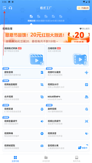 1、打開格式工廠的應(yīng)用APP,進入首頁點擊左上角的圖標(biāo)。