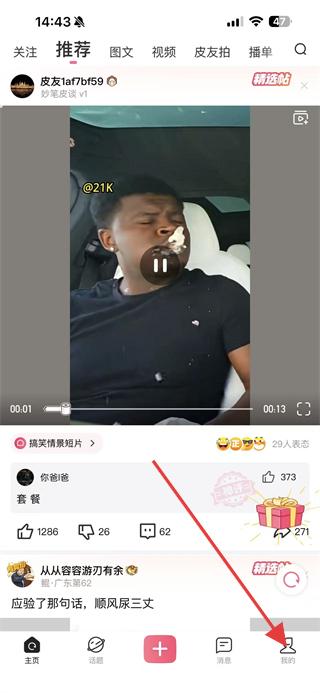 1、打開(kāi)皮皮搞笑APP,進(jìn)入到首頁(yè)內(nèi)點(diǎn)擊右下角我的圖標(biāo)。