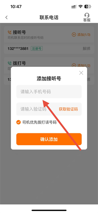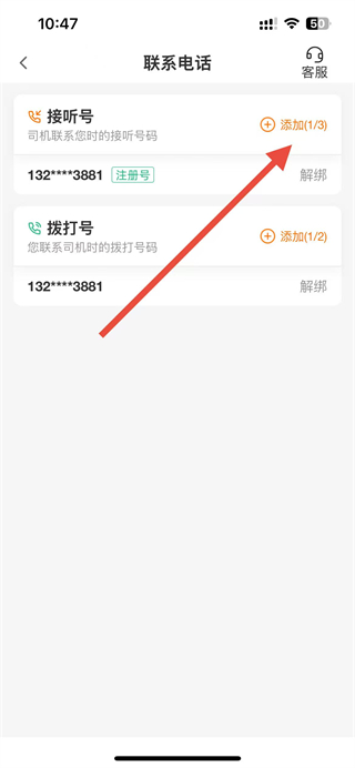 3、在聯(lián)系電話頁面點擊添加按鈕,彈出添加接聽號或撥打號的輸入框。
