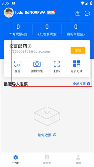 3、登錄后進(jìn)入工作臺,可查看本月發(fā)票、未處理發(fā)票等數(shù)據(jù),以及收票郵箱信息。