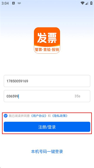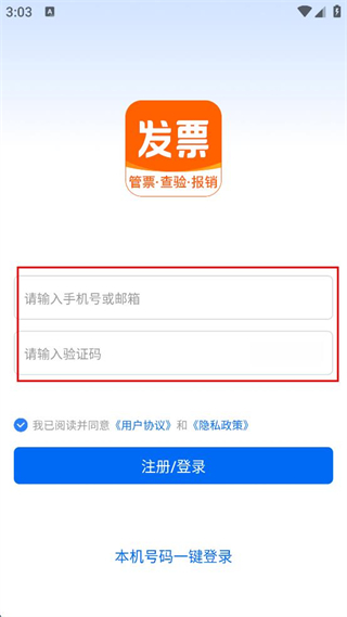 1、打開發(fā)票管理軟件,在登錄頁面輸入手機(jī)號或郵箱,點(diǎn)擊獲取驗(yàn)證碼并輸入。