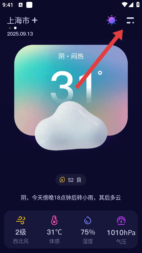1、在超準(zhǔn)天氣預(yù)報主界面,點擊右上角設(shè)置圖標(biāo),進入設(shè)置頁面。