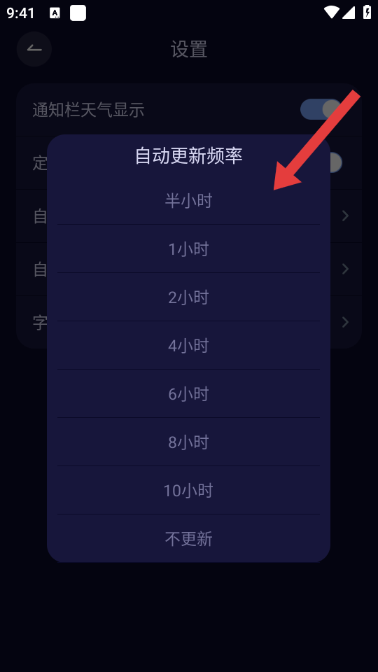 4、在更新頻率選擇列表中,點擊要設(shè)置的頻率,即可完成自動更新頻率的設(shè)置。