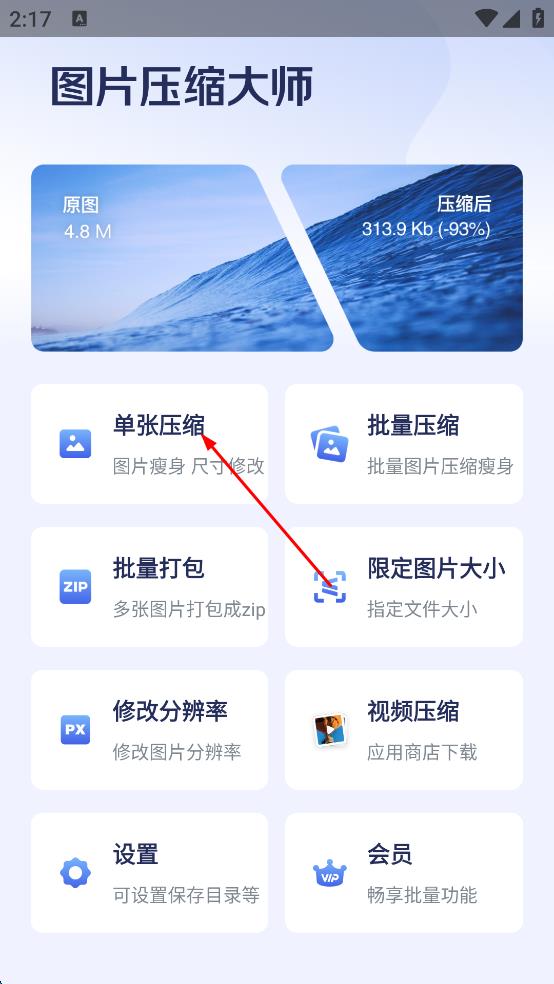 1、打開圖片壓縮大師APP,點(diǎn)擊單張壓縮。