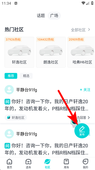 2、在社區(qū)的頁面,點擊右下角發(fā)布的按鈕,彈出發(fā)布選項菜單。