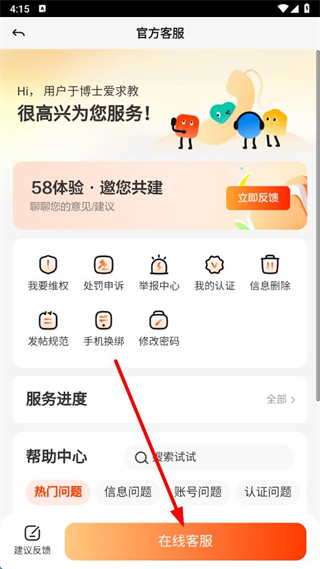 3、進入官方客服頁面后,點擊下方在線客服按鈕。