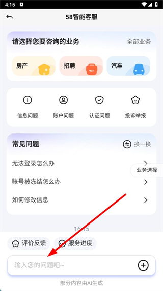 4、在58智能客服頁面的輸入框中輸入問題,即可聯(lián)系客服咨詢。