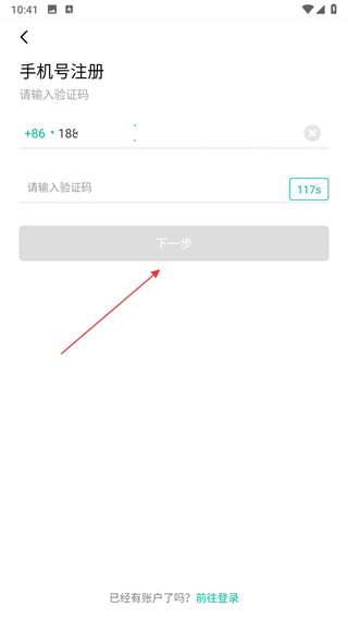 3、輸入收到的驗證碼,點擊下一步即可完成賬號的注冊。