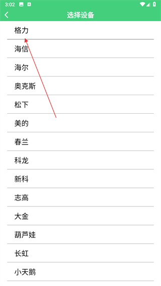 3、進(jìn)入選擇設(shè)備頁(yè)面后,選擇空調(diào)品牌,點(diǎn)擊進(jìn)入遙控頁(yè)。