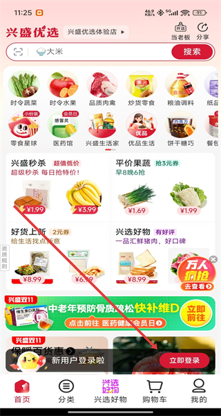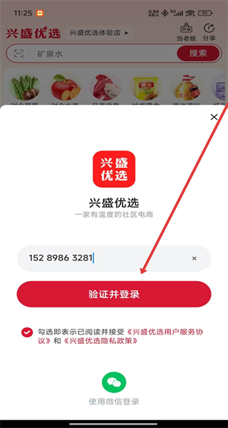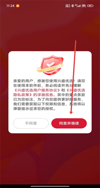 1、點擊“興盛優(yōu)選用戶服務協(xié)議及隱私政策”彈窗的“同意并繼續(xù)”,進入興盛優(yōu)選主界面。